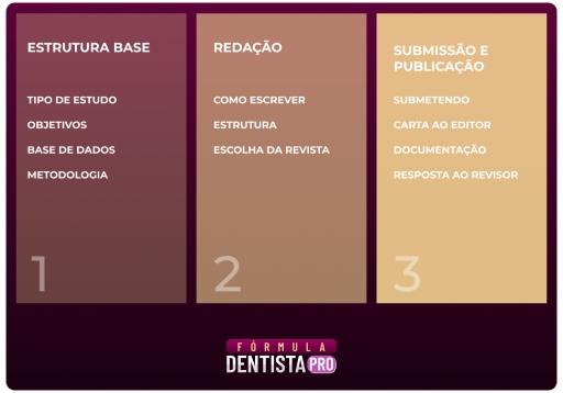 O Fórmula Dentista PRO é um curso online completo e prático, dividido em módulos que acompanham sua jornada desde o início da pesquisa até a publicação final do artigo. Tudo com foco exclusivo na Odontologia.